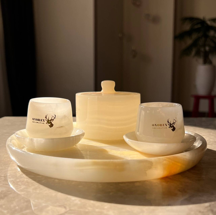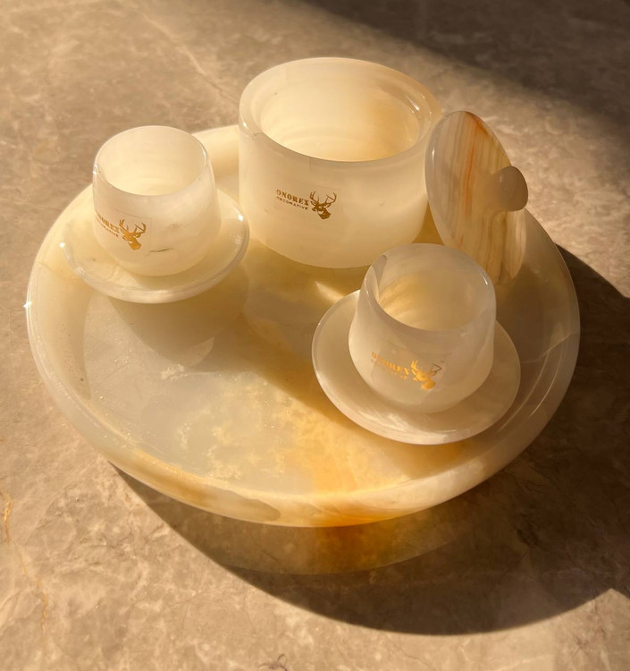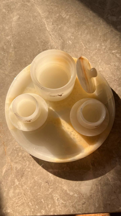 ست سنگی سینی یک قندان و دو عدد فنجان و نعلبکی سنگی مرمر
