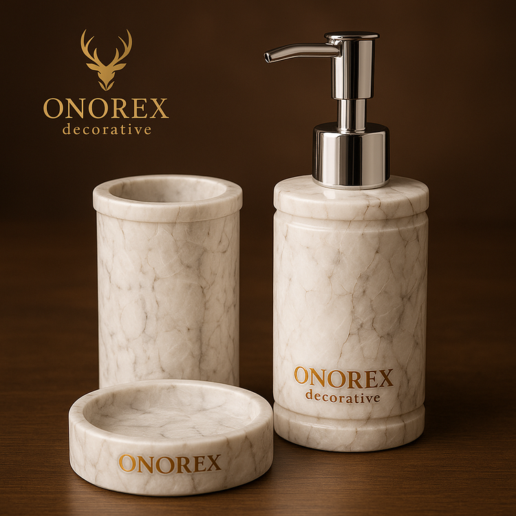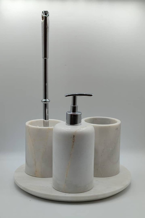 با این ست سرویس بهداشتی لوکس، جلوهای خاص به فضای حمام و دستشویی خود ببخشید. این مجموعه شامل جا مایعی، جا صابونی و جا مسواکی است که همگی با دقت و مهارت بالا از سنگ طبیعی تراش خوردهاند.