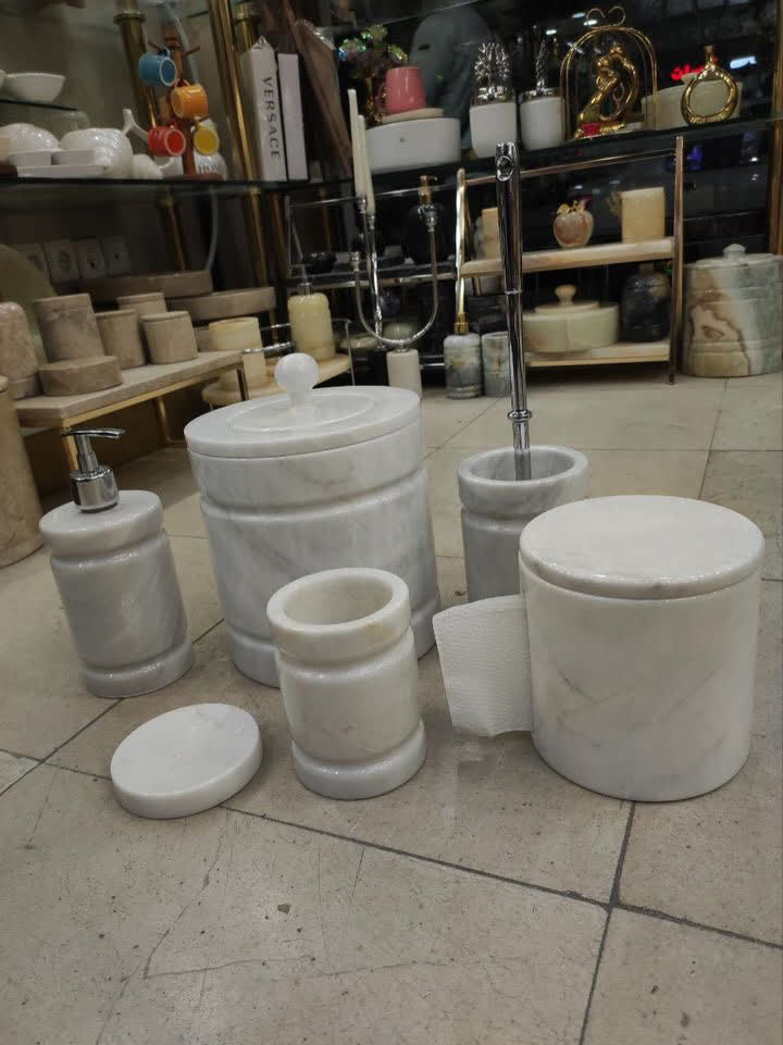 با این ست سرویس بهداشتی لوکس، جلوهای خاص به فضای حمام و دستشویی خود ببخشید. این مجموعه شامل جا مایعی، جا صابونی و جا مسواکی است که همگی با دقت و مهارت بالا از سنگ طبیعی تراش خوردهاند.