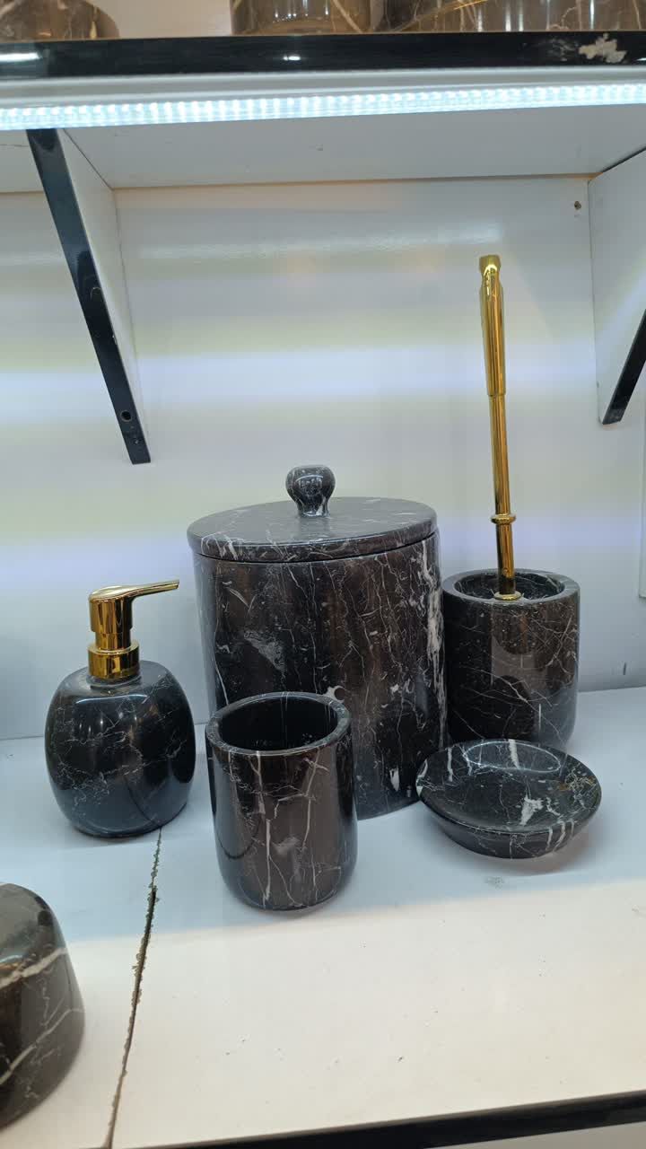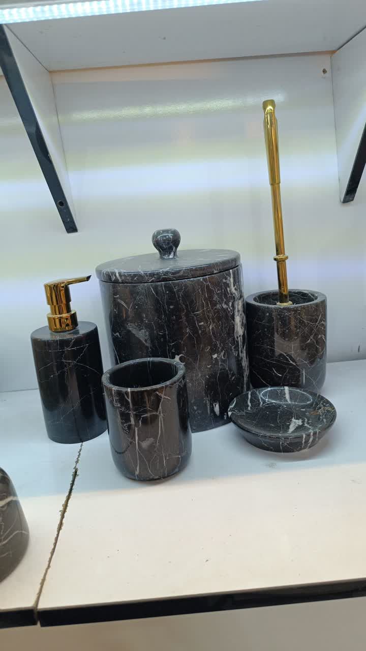ست ۵ تیکه جا مایعی جاصابونی جا فرچه ، جا مسواکی ،سطل زباله مرمریت مشکی دسته طلایی