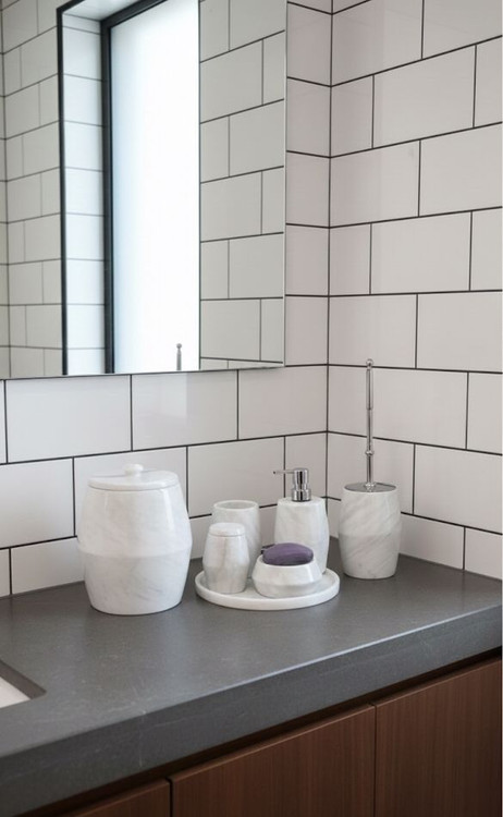 ست 6 تیکه جا ,سینی سنگی ،مایعی جاصابونی جا فرچه ، جا مسواکی ،سطل زباله مرمریت سفید