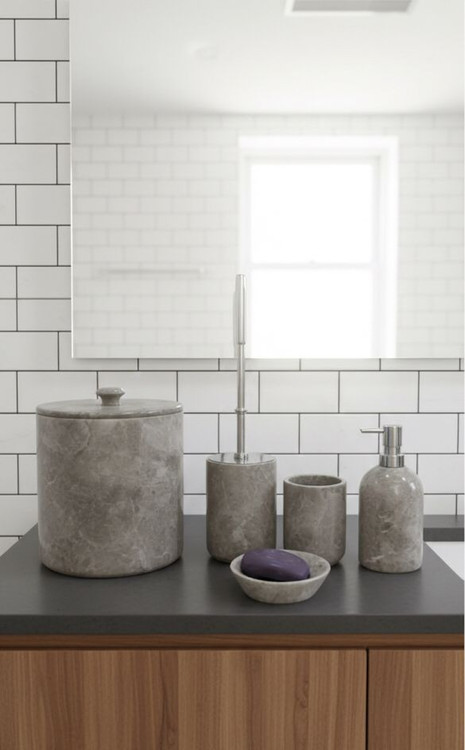 ست 6 تیکه جا ,سینی سنگی ،مایعی جاصابونی جا فرچه ، جا مسواکی ،سطل زباله مرمریت طوسی