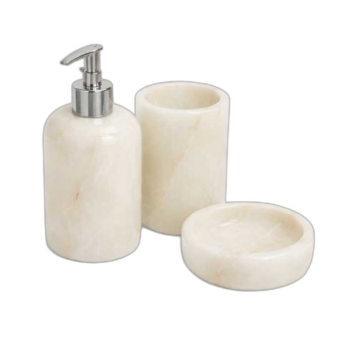 با این ست سرویس بهداشتی لوکس، جلوهای خاص به فضای حمام و دستشویی خود ببخشید. این مجموعه شامل جا مایعی، جا صابونی و جا مسواکی است که همگی با دقت و مهارت بالا از سنگ طبیعی تراش خوردهاند.